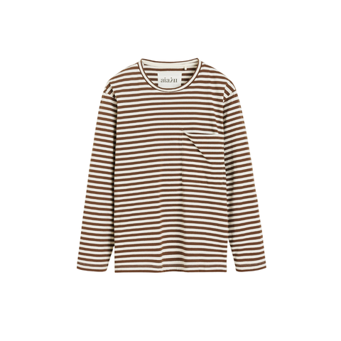 Klassisk langærmet T-shirt med rund hals, brystlomme og dropped shoulders. Den har en behagelig, løs silhuet, der giver et afslappet og moderne udtryk.