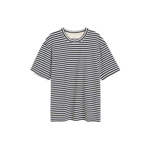 Denne Aiayu Lui Circular Striped Tee i Mix Night er en tidløs og alsidig t-shirt med et klassisk, maritimt præg. T-shirten er fremstillet i blød, kraftig jersey bestående af 50 % økologisk bomuld og 50 % genanvendt bomuld – et udtryk for Aiayus fokus på cirkulær produktion og ansvarlige materialer. Den har en regulær, let oversized pasform med rund hals og korte ærmer, der skaber et ubesværet og elegant hverdagslook. De brede striber giver et grafisk og moderne udtryk, som gør denne t-shirt både stilfuld og nem at style med alt fra jeans til løsere bukser. Det broderede Aiayu-logo på ryggen tilfører et subtilt, designerpræget touch, som løfter basisstykket til en essentiel del af garderoben.