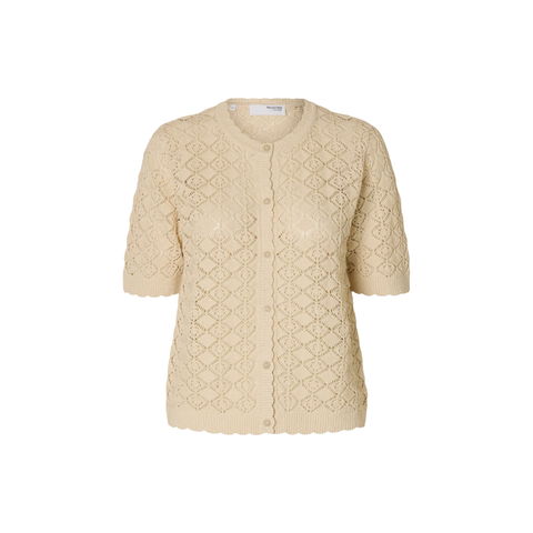 Strickjacke von Selected Femme mit femininem und zeitlosem Design. Es hat kurze Ärmel und einen durchgehenden Knopfverschluss, der ihm einen klassischen Look verleiht. Die Strickjacke ist in einem wunderschönen Muster gestrickt und mit feinen Wellenkanten entlang der Ärmel und am unteren Ende versehen.