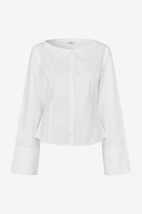 Langærmet skjorte med normal pasform og bådudskæring. Gennemgående knaplukning foran og brede manchetter. Hovedmateriale fremstillet af bomuld.