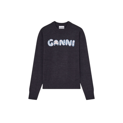 Eksklusiv GANNI sweater i farven Phantom (gråsort), designet i blød og glatstrikket kvalitet. Sweateren har klassiske ribkanter ved hals, ærmer og bund, som sikrer en flot pasform og komfort hele dagen. Foran prydes den af hæklede bogstaver i hvid og lyseblå med fine lyserøde blomster, der tilsammen danner det ikoniske “GANNI” logo – et feminint og unikt statement-look. Strikken er fremstillet hovedsageligt i blød uld med indslag af bomuld, hvilket giver en varm, åndbar og behagelig sweater perfekt til både hverdag og sæsonens køligere dage.