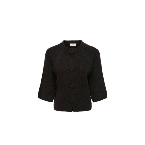 Denne cardigan har en rund halsudskæring og 3/4 ærmer, der giver et afslappet og stilfuldt look. Den er designet med knaplukning, hvilket tilføjer en klassisk og funktionel detalje. Pasformen er almindelig, som sikrer komfort hele dagen. Farven er en dyb chokoladebrun, der passer godt til både varme og kølige sæsoner, hvilket gør den ideel til vinterbrug. Cardiganen er strikket og fremstillet med fokus på blødhed og varme, så du kan føle dig behageligt tilpas i forskellige situationer og anledninger.