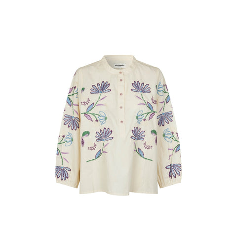 Denne elegante cremefarvede bluse er dekoreret med fine broderede detaljer, som tilfører et feminint og raffineret udtryk. Blusen har en behagelig pasform og et let materiale, der sikrer komfort hele dagen. Det tidløse design gør blusen nem at style til både hverdagsbrug og mere formelle anledninger. Perfekt sammen med både jeans, nederdel eller klassiske bukser for et stilfuldt og alsidigt look.