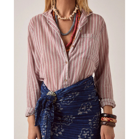 Afslappet skjorte i fin bomulds-dobby. Krave, gennemknappet front og lange ærmer med manchetter og knapper. Pyjamasinspireret silhuet, let og ubesværet. Designet til at blive båret uden regler. Lys blå bund med lodrette vinfarvede striber – varme og dybe, afslappede snarere end polerede. Inspireret af vintage pyjamasskjorter og arvede stykker tøj. Striberne føles intime og velkendte, som stof lånt fra en anden tid. Kast den over en bikini efter en dag på stranden, style den med en pareo, eller brug den med jeans. Fungerer løst og uknappet eller stylet præcis som du vil.
