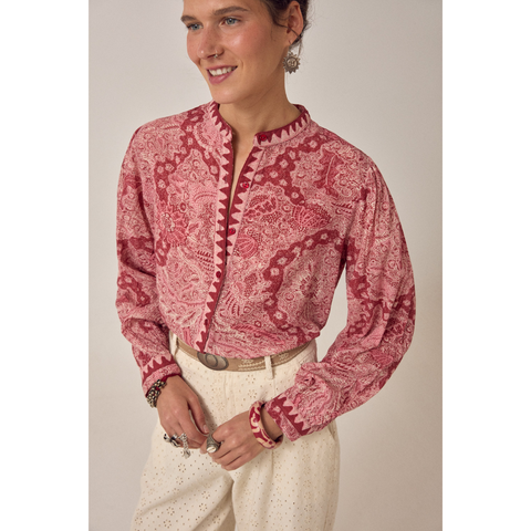 Bomuldsbluse i varm rød med tæt Java-print af paisley- og blomstermotiver. Rund hals med flæsekant og knaplukning foran. Lange ballonærmer og løs, voluminøs pasform.