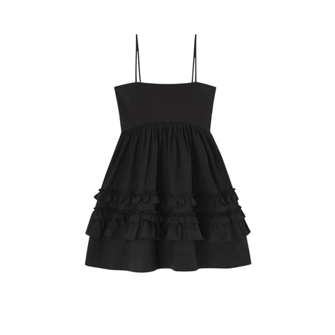 Elegant black dress from Ganni with a feminine and slightly expressive silhouette. The dress is designed with a figure-hugging top that beautifully highlights the body, while the voluminous skirt with soft ruffles adds movement and an airy fall. The narrow straps and simple, clean top give the dress a modern and minimalist look, making it easy to style both for everyday wear with flat shoes and for a party with heels. A timeless Ganni dress that is made to be worn again and again, season after season.