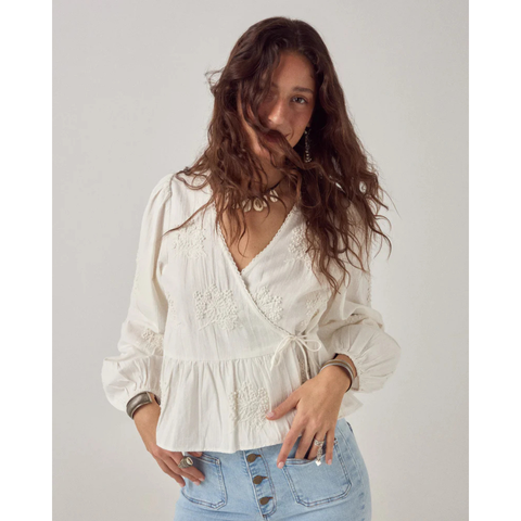 Slå-om-bluse i blød bomuld med diskret broderi spredt over stoffet. Den vikles omkring kroppen og bindes i siden, med lange ærmer og en afslappet peplum ved taljen. Broderiet er kun let hævet – tænkt til at blive mærket mere end set.