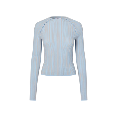 Denne langærmede sweater har en flatterende slim fit pasform og er designet med ribstrikkede, tofarvede lodrette striber, der skaber et elegant og moderne udtryk. En fin bølget sømdetalje foran tilfører et feminint og unikt touch. Blusen har klassisk rund hals samt rene afslutninger ved ærmer og kant, som understreger det stilrene design. Materialet er en blød og behagelig blanding med blandt andet viskose og nylon, der sikrer komfort og en smidig pasform. Perfekt til både hverdag og kontor – style den med jeans, nederdel eller klassiske bukser for et tidløst look.
