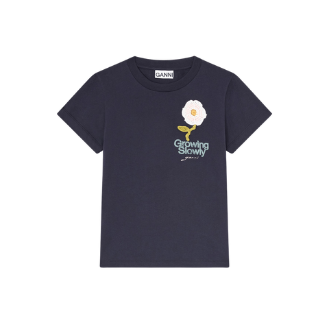 Sød klassisk t-shirt i blød bomuldsjersey, med broderet blomsterdetalje på venstre bryst. T-shirten har en baby fit pasform, der smukt fremhæver kroppens silhuett.
