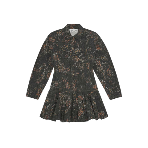 Printed Stretch Cotton Buttoned Mini Dress fra Ganni er en figursyet kjole i økologisk bomuldsblanding med elastan. Den har lange ærmer, klassisk krave og en plisseret nederdel, der giver et feminint udtryk. Det mørke mønster tilfører dybde, og kjolen kan styles med både støvler og loafers til hverdag og aften.