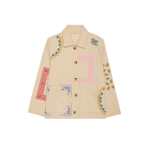 Meine Jacke ist aus 100 % Bio-Baumwoll-Canvas gefertigt und hat eine lockere Passform. Sie verfügt über einen kleinen Hemdkragen und lange Ärmel. Zwei Taschen und eine Knopfleiste in Beinform runden das Design ab. Die Jacke ist mit farbenfrohen und poetischen Stickereien verziert, die von Vintage-Servietten inspiriert sind.